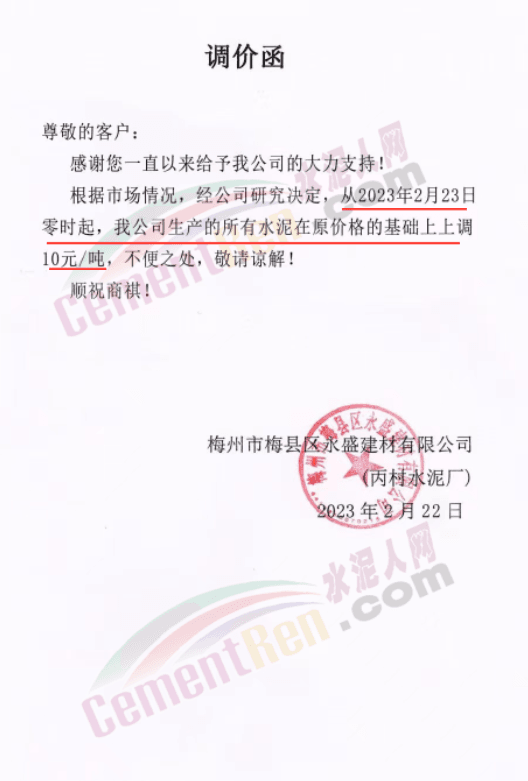 梅州市梅縣區(qū)永盛建材有限公司通知,2月23日零時起,所有水泥上調10元/噸。