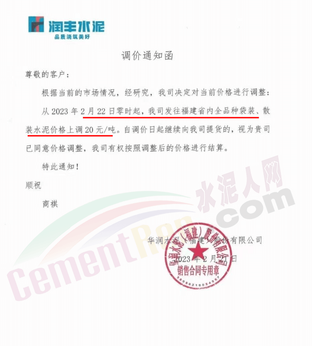 華潤水泥通知2月22日零時起,公司發(fā)往福建省水泥價格上調20元/噸。