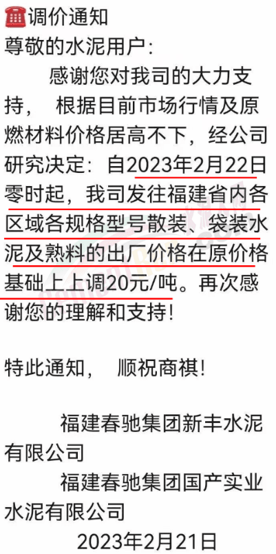 福建春馳通知2月22日零時起,發(fā)往福建省區(qū)域各規(guī)格水泥及熟料出廠價格上調20元/噸。