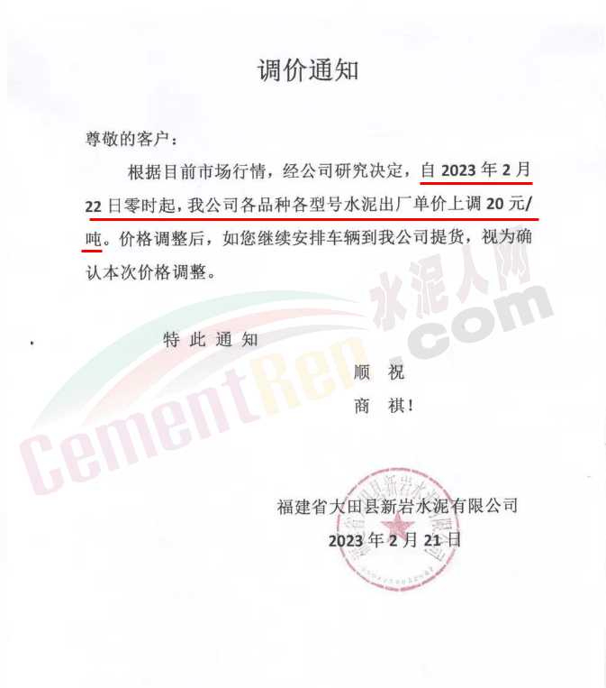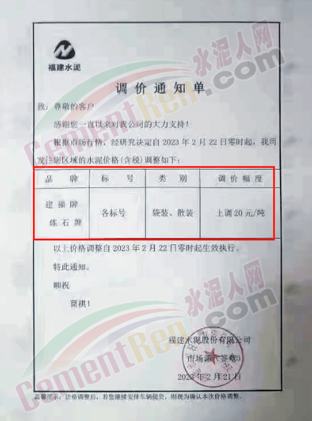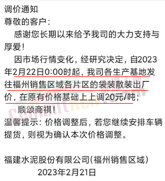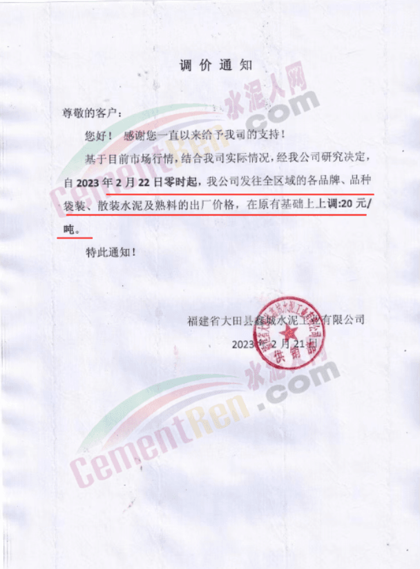 福建龍麟集團通知自2023年2月22日零時起,公司發(fā)往福建區(qū)域各規(guī)格型號袋裝、散裝水泥以及熟料,在原價格基礎上每噸上調20元/噸。
