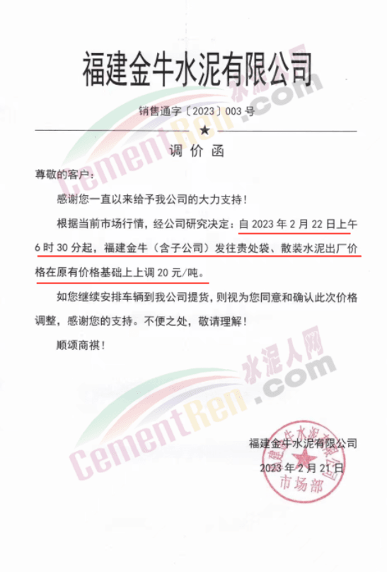 福建金牛水泥有限公司通知,2月22日上午6時30分起,上調水泥價格20元/噸。