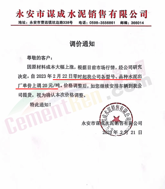 永安市謀成永泥銷售有限公司通知,自2023年2月22日零時起公司各型號、品種水泥出廠單價上調20元/噸。