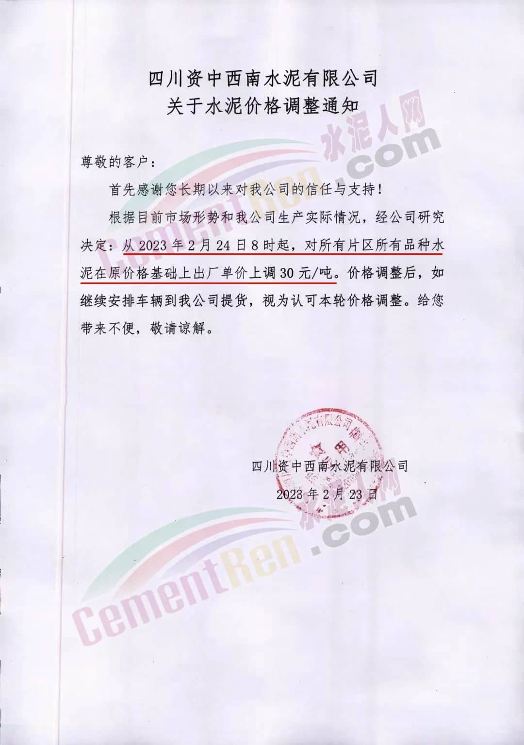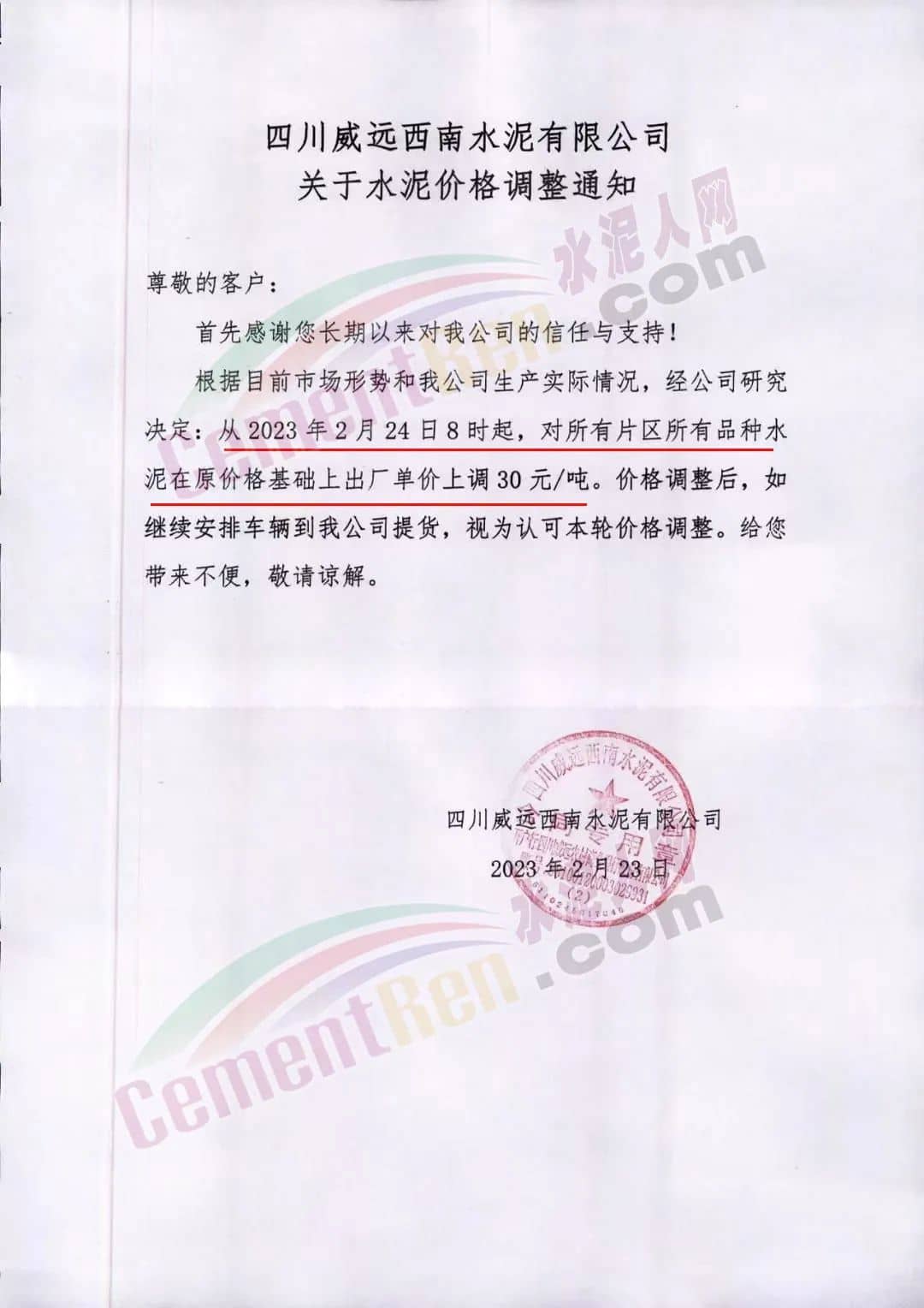 四川威遠西南水泥有限公司通知,根據(jù)目前市場形勢和公司生產實際情況,經(jīng)公司研究決定從2023年2月24日8時起,對所有片區(qū)所有品種水泥在原價格基礎上出廠單價上調 30 元/噸。