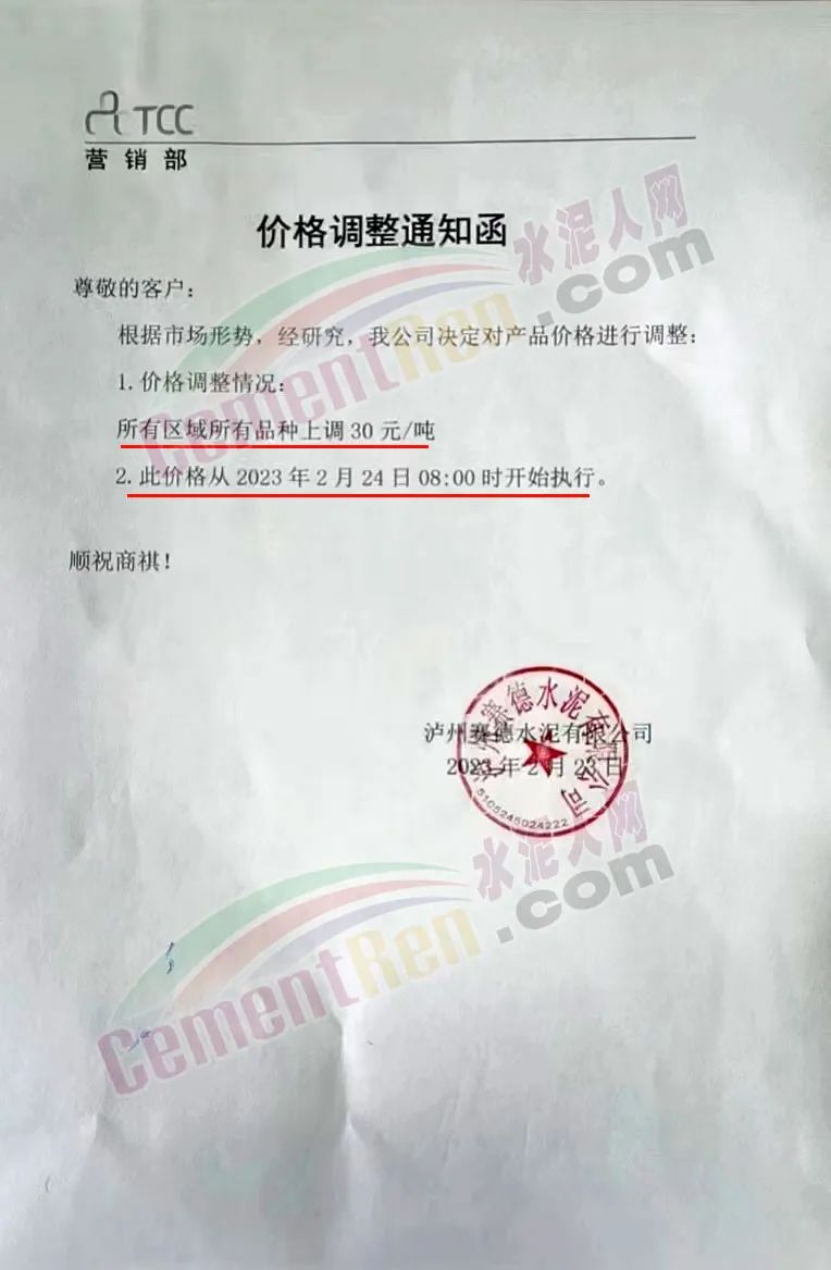 瀘州賽德水泥有聚公司通知從2023年2月24日8時開始,所有區(qū)域所有品種上調30元/噸。