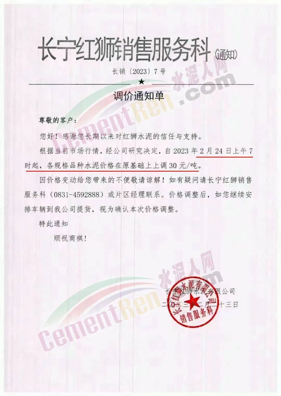 長寧紅獅銷售服務科通知,根據(jù)當前市場行情,經(jīng)公司研究決定,自2023年2月24日上午7時起,各規(guī)格品種水泥價格在原基礎上上調30元/噸。
