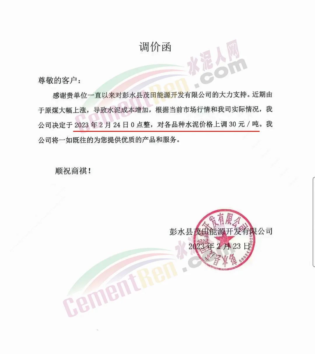 彭水縣茂田能源開發(fā)有限公司通知,近期由于原煤大幅上漲,導致水泥成本增加,根據(jù)當前市場行情和我司實際情況,定于2023年2月24日0點整,對各品種水泥價格上調30元/噸。