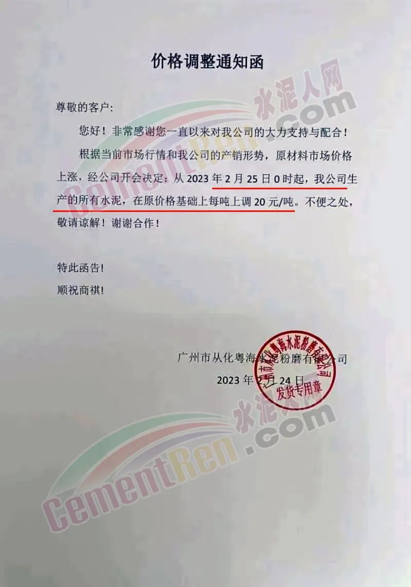 日前,廣州市從化粵海水泥粉磨有限公司通知,根據(jù)當前市場行情和公司的產銷形勢,原材料市場價格上漲,從2023 年2月25日0時起,公司生產的所有水泥,在原價格基礎上每噸上調 20 元/噸。