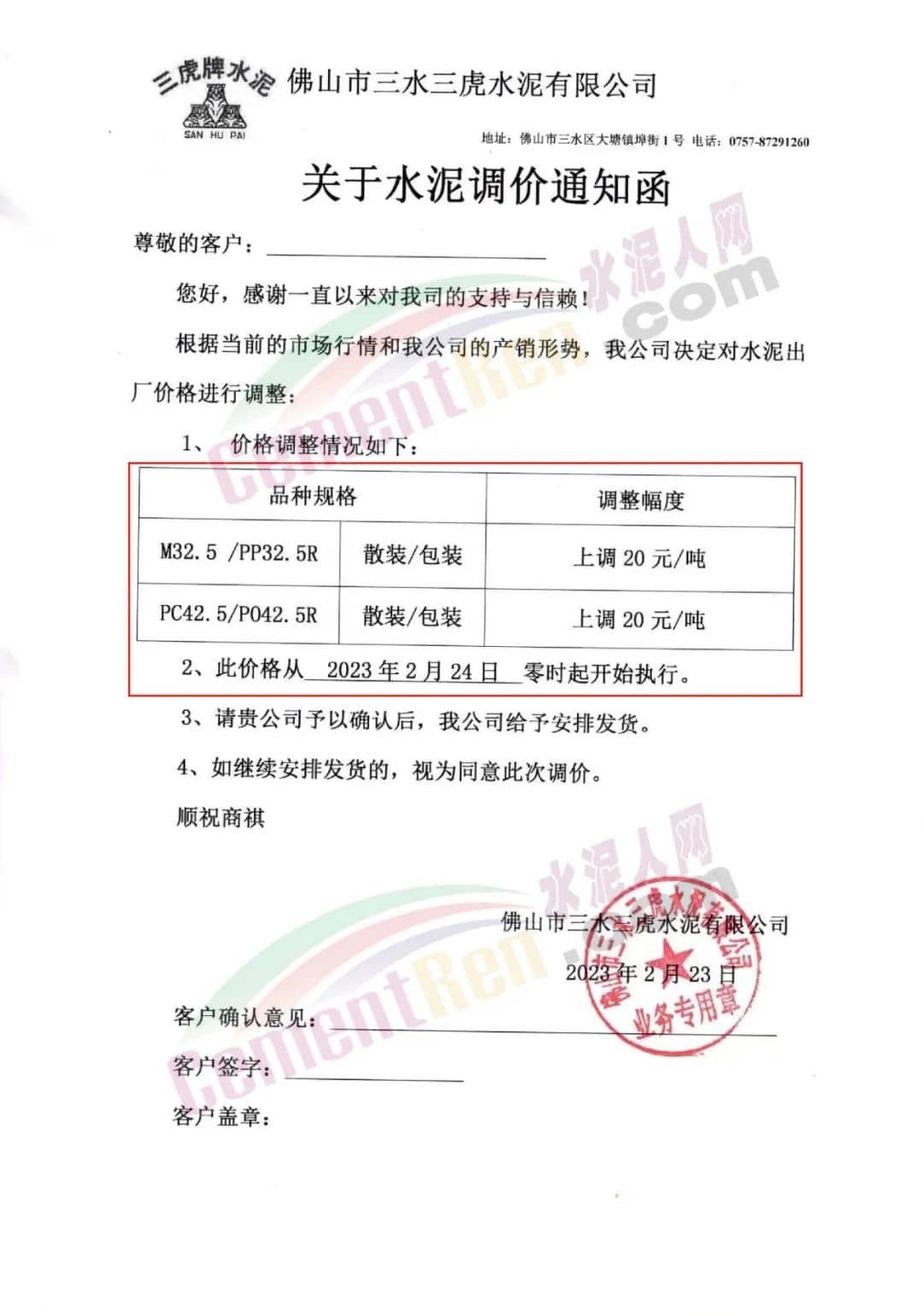 佛山市三水三虎水泥有限公司通知,自2月24日零時起,對各標號水泥出廠價格上調20元/噸。