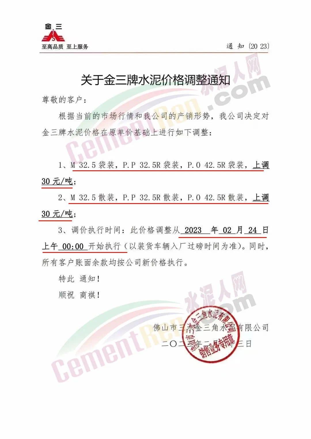 佛山市金三角水泥有限公司通知根據(jù)當前的市場行情和公司的產銷形勢,決定從2月24日0時起對M32.5袋裝,PP32.5R袋裝,P.O42.5R袋裝,上調30元/噸;M32.5散裝,P.P32.5R散裝,P.O42.5R散裝,上調30元/噸。