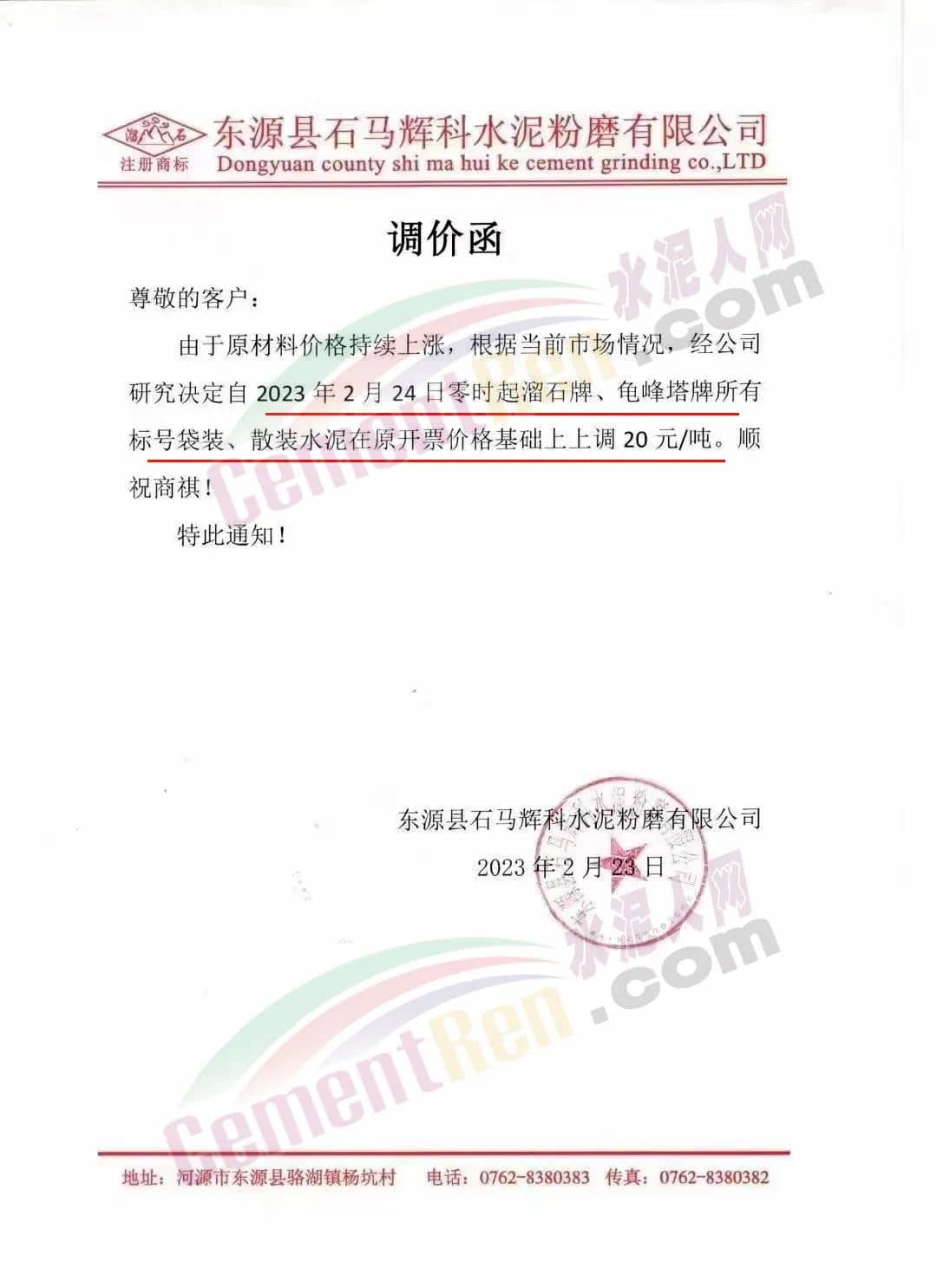 東源縣石馬輝科水泥粉磨有限公司通知,由于原材料價格持續(xù)上漲,根據(jù)當前市場情況,經(jīng)公司研究決定自2023年2月24日零時起溜石牌、龜峰塔牌所有標號袋裝、散裝水泥在原開票價格基礎上上調20 元/噸。