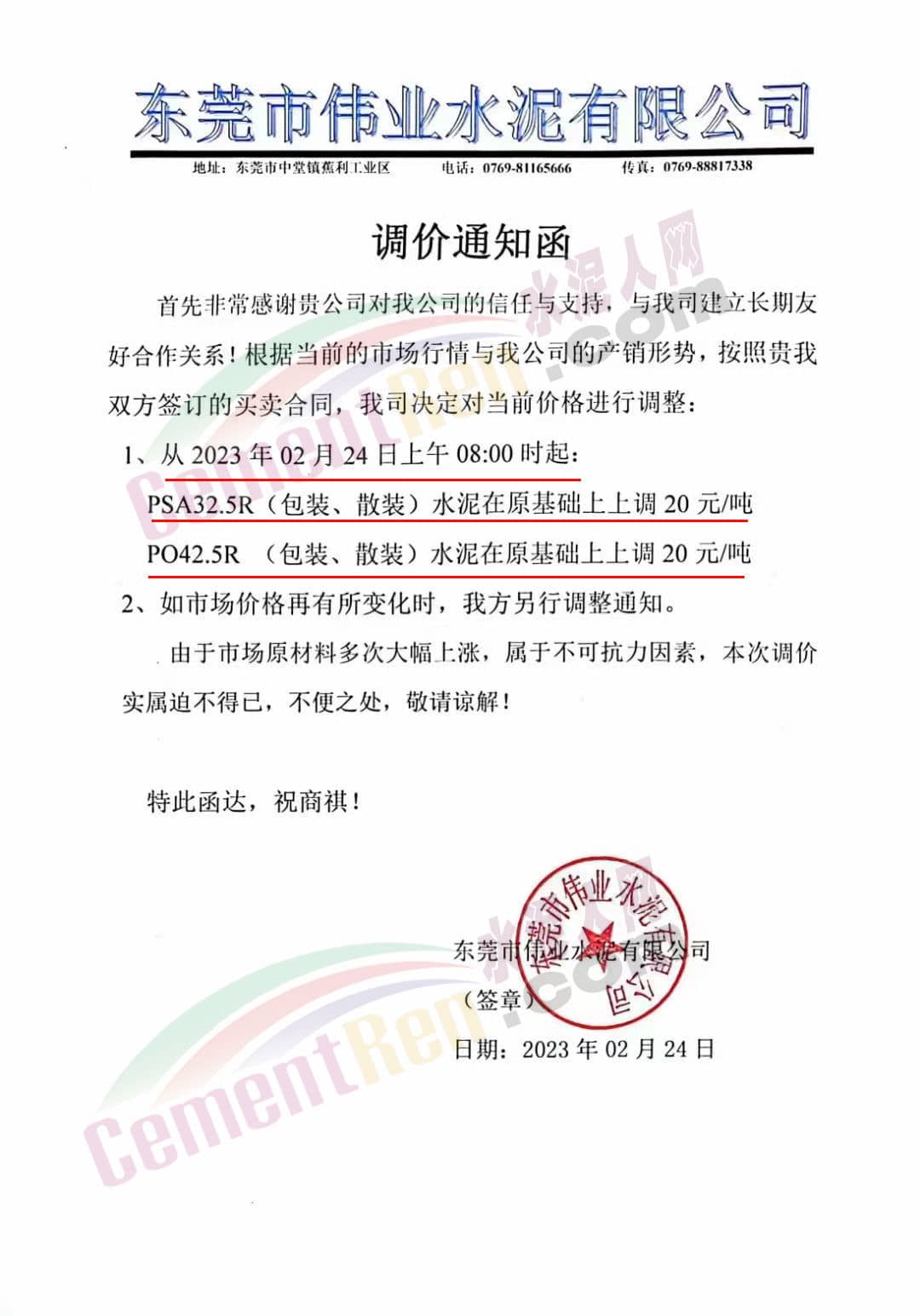 東莞市偉業(yè)水泥有限公司通知,根據(jù)當前的市場行情與公司的產銷形勢,決定從2023年2月24 日上午8時起PSA32.5R(包裝、散裝)水泥在原基礎上上調20元/噸;PO42.5R(包裝、散裝)水泥在原基礎上上調20元/噸。