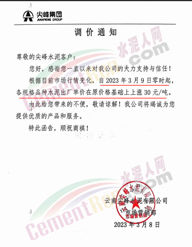 云南尖峰水泥通知,根據(jù)目前市場行情變化,自2023年3月9日零時起各規(guī)格品種水泥出廠價上調(diào) 30元/噸。