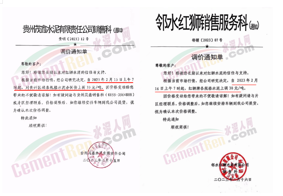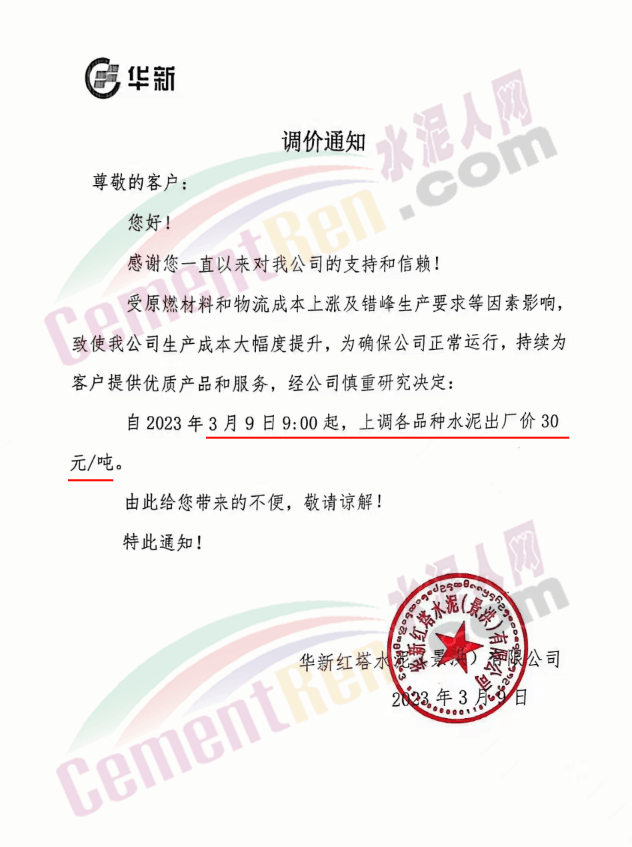 華新紅塔水泥(景洪)有限公司通知,受原燃材料和物流成本上漲及錯峰生產(chǎn)要求等因素影響,致使公司生產(chǎn)成本大幅度提升,為確保公司正常運(yùn)行,持續(xù)為客戶提供優(yōu)質(zhì)產(chǎn)品和服務(wù),經(jīng)公司慎重研究決定,自2023年3月9日9時起,上調(diào)各品種水泥出廠價30元/噸。