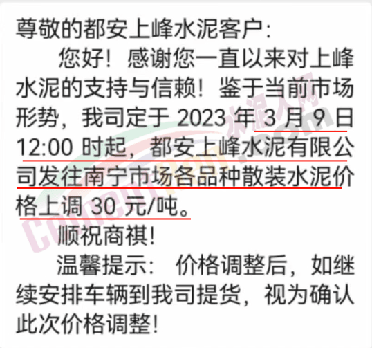 廣西都安上峰通知,鑒于當(dāng)前市場形勢,公司定于2023年3月9日12時起,發(fā)往南寧市場各品種散裝水泥價格上調(diào)30元/噸。