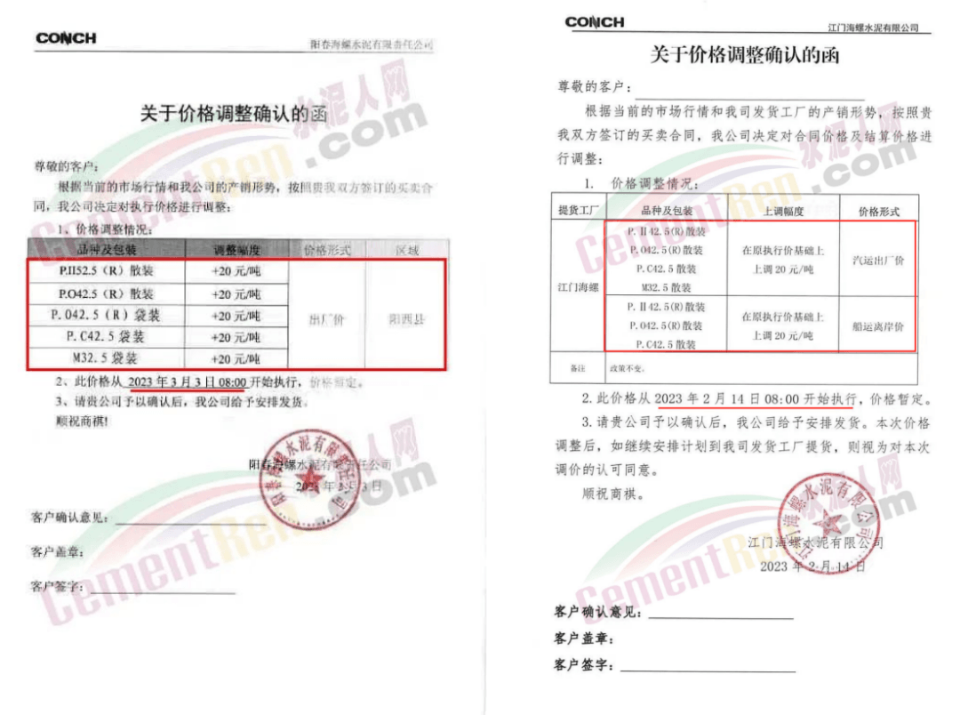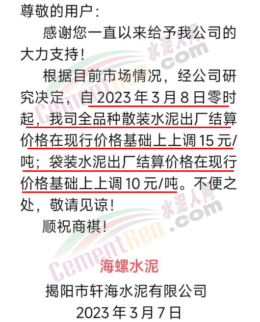 經(jīng)銷海螺水泥的揭陽市軒海水泥有限公司通知,根據(jù)目前市場情況,經(jīng)公司研究決定,自2023年3月8日零時起,公司全品種散裝水泥出廠結(jié)算價格在現(xiàn)行價格基礎(chǔ)上上調(diào)15元噸;袋裝水泥出廠結(jié)算價格在現(xiàn)行價格基礎(chǔ)上上調(diào)10元/噸。