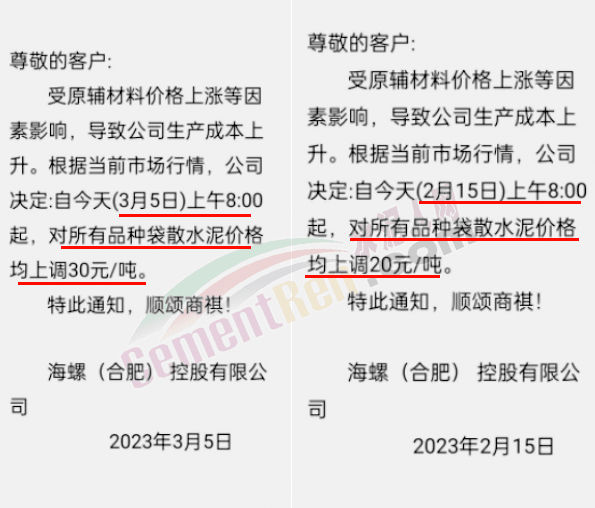 海螺(合肥)控股有限公司分別于2月15日和3月5日通知上調(diào)水泥價格20元/噸、30元/噸,兩次累計(jì)上調(diào)50元/噸。