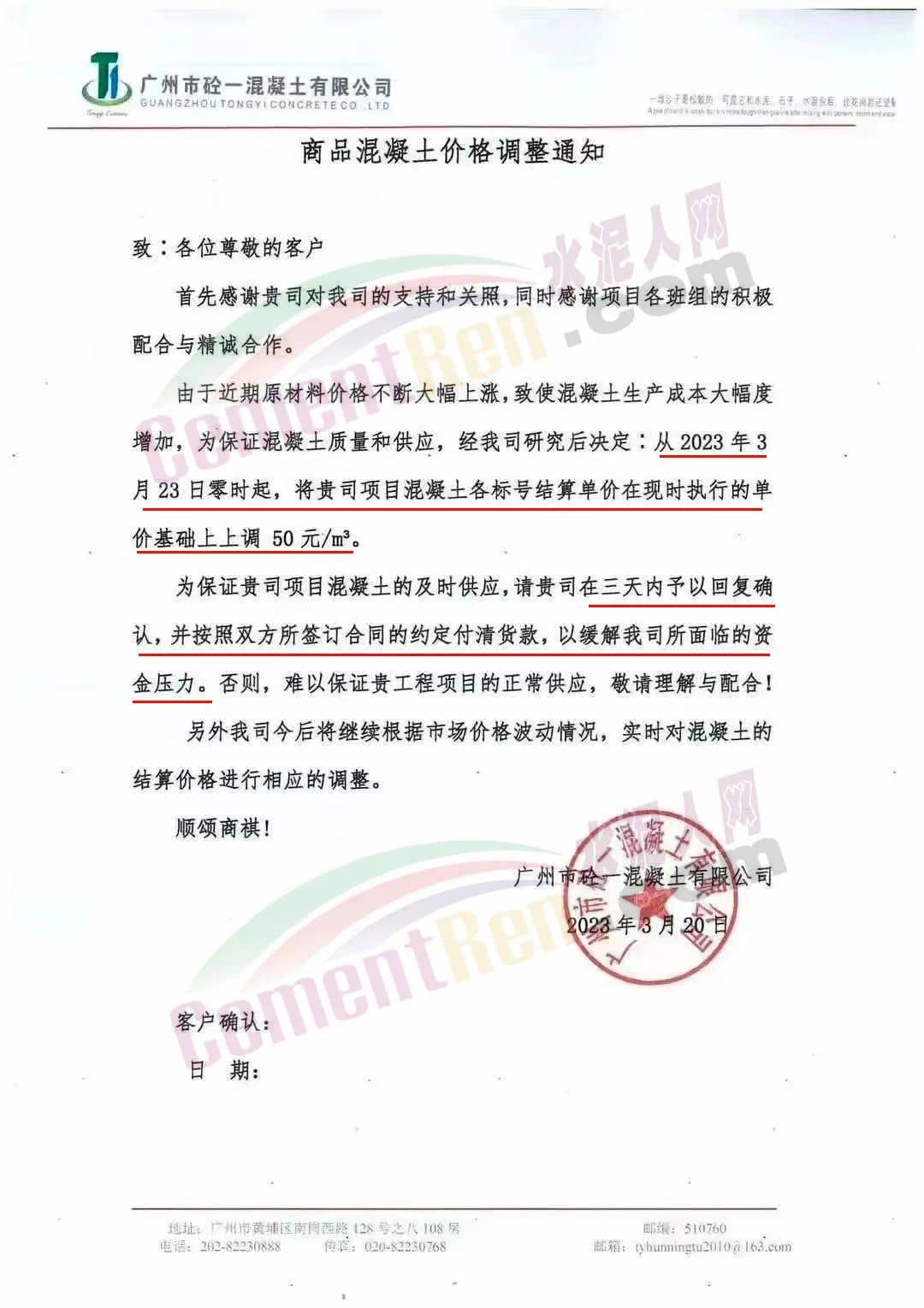 廣州市砼一混凝土有限公司通知由于近期原材料價格不斷大幅上漲,致使混凝土生產(chǎn)成本大幅度增加,為保證混凝土質(zhì)量和供應(yīng),經(jīng)公司研究后決定從2023年3月23日零時起,混凝土各標(biāo)號結(jié)算單價在現(xiàn)時執(zhí)行的單價基礎(chǔ)上上調(diào)50元/立方。為保證項目混凝土的及時供應(yīng),請客戶三天內(nèi)予以回復(fù)確認(rèn),并按照雙方所簽訂合同的約定付清貨款,以緩解公司所面臨的資金壓力,否則,難以保證工程項目的正常供應(yīng)。