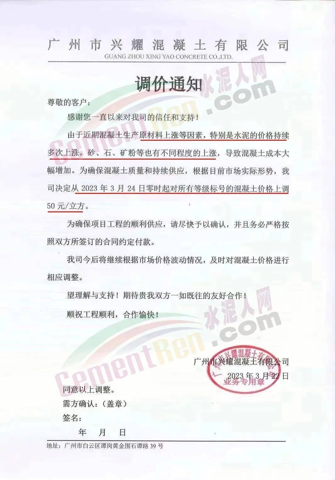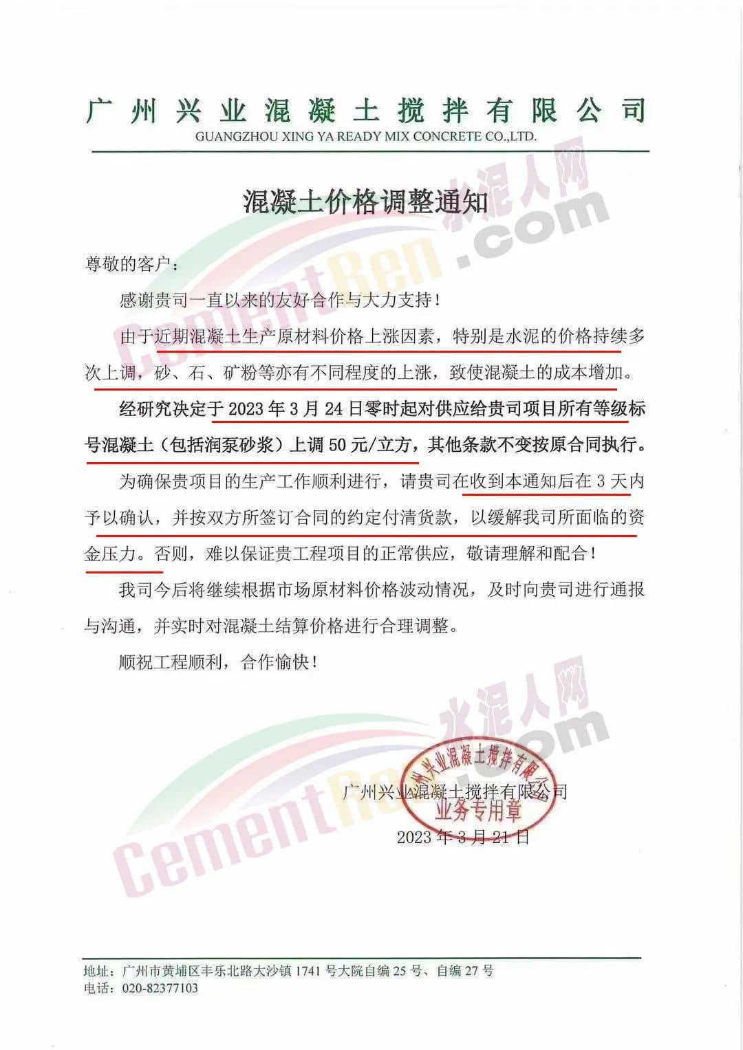 廣州興業(yè)混凝土攪拌有限公司通知由于近期混凝土生產(chǎn)原材料價格上漲因素,特別是水泥的價格持續(xù)多次上調(diào),砂、石、礦粉等亦有不同程度地上漲,致使混凝土的成本增加。經(jīng)研究決定于2023年3月24日零時起對所有等級標(biāo)號混凝土(包括潤泵砂漿)上調(diào)50元/立方,請客戶在收到通知后在3天內(nèi)予以確認(rèn),并按雙方所簽訂合同的約定付清貨款,以緩解公司所面臨的資金壓力,否則,難以保證工程項目的正常供應(yīng)。