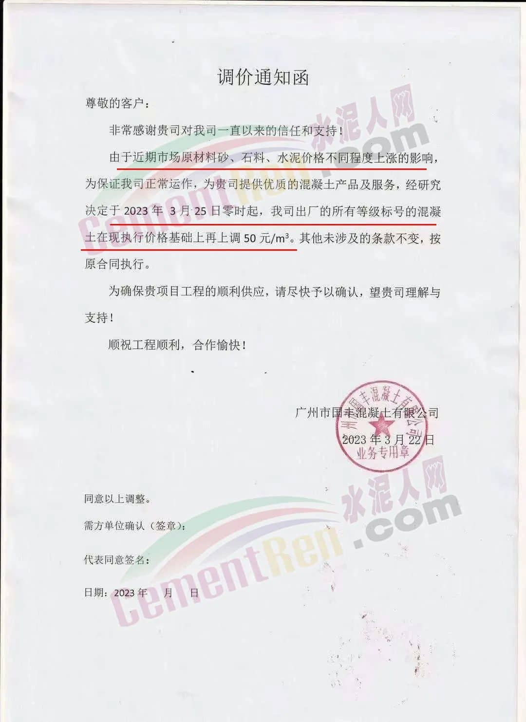 廣州市國豐混凝土有限公司通知由于近期市場原材料砂、石料、水泥價格不同程度上漲的影響,為保證公司正常運作,經(jīng)研究決定于2023年3月25日零時起,公司出廠的所有等級標(biāo)號的混凝土在現(xiàn)執(zhí)行價格基礎(chǔ)上再上調(diào)50元/立方。