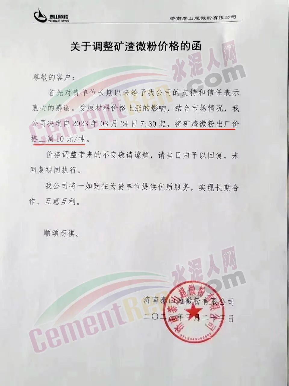 濟南泰山超微粉有限公司關(guān)于調(diào)整礦渣微粉價格的函稱,受原材料價格上漲的影響,結(jié)合市場情況,公司決定自2023年03月24日7:30起,將礦渣微粉出廠價格上調(diào)10元/噸。