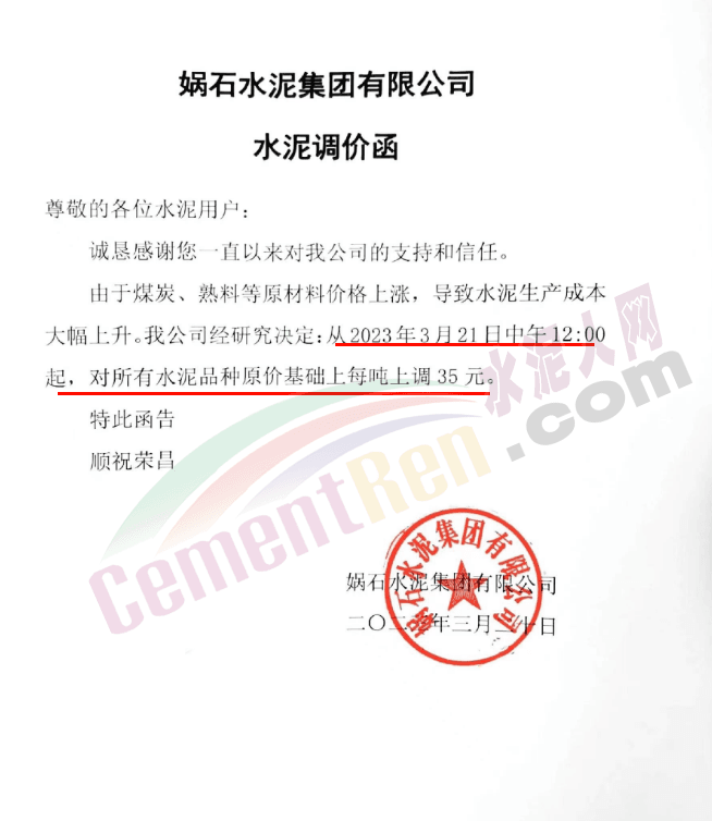 媧石水泥集團有限公司通知,由于煤炭、熟料等原材料價格上漲,導(dǎo)致水泥生產(chǎn)成本大幅上升。公司經(jīng)研究決定從2023年3月21日中午12:00起,對所有水泥品種原價基礎(chǔ)上每噸上調(diào)35元。