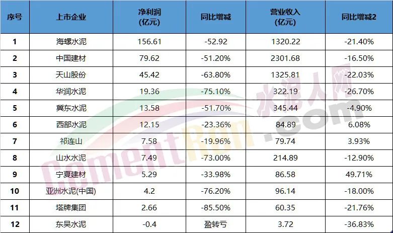 近期12家水泥上市公司先后發(fā)布了2022年度業(yè)績(jī)報(bào)告,其中包括海螺水泥、冀東水泥、華潤(rùn)水泥在內(nèi)的9家水泥上市公司呈現(xiàn)營(yíng)收、利潤(rùn)額雙下滑的情況,西部水泥、祁連山、寧夏建材3家上市公司出現(xiàn)增收不增利的情況。