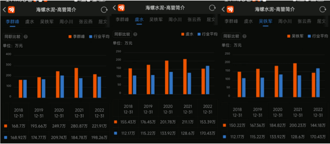 從海螺水泥2022年度報(bào)告數(shù)據(jù)可見(jiàn),2022年度海螺水泥營(yíng)業(yè)收入和凈利潤(rùn)雙雙下滑,截至2022年12月31海螺水泥上市公司14位高管中已公布薪酬的9位高管薪酬合計(jì)約1068萬(wàn)元。包括總經(jīng)理李群峰、副總經(jīng)理虞水、吳鐵軍等在內(nèi)的多位高管2022年薪酬較2021年有所減少。其中,李群峰降薪58.97萬(wàn)元,虞水降薪57.71萬(wàn)元,吳鐵軍降薪56.05萬(wàn)元。