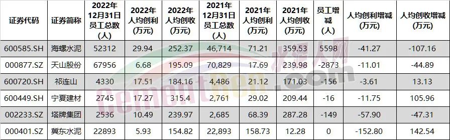 從上市公司近兩年員工人數(shù)來(lái)看,A股6家主要品牌企業(yè)除海螺水泥增加5598人外,其他企業(yè)均有數(shù)量不等的減員。人均創(chuàng)收及創(chuàng)利也有不同幅度的下滑。其中海螺水泥人均創(chuàng)利減少41.27萬(wàn)元,人均創(chuàng)收減少107.16萬(wàn)元。