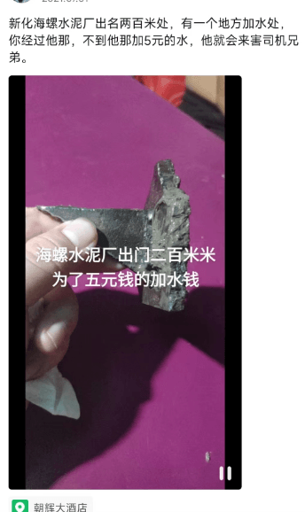 新化海螺水泥廠,有個地方加水處,經(jīng)過他那里不加5元的水,他就會來害司機兄弟……