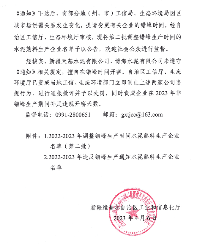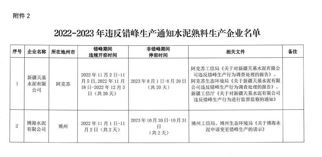 日前,新疆維吾爾自治區(qū)工信廳發(fā)布公告文件公開(kāi)通報(bào)新疆天基水泥有限公司、博海水泥有限公司未遵守《通知》相關(guān)規(guī)定,擅自在錯(cuò)峰時(shí)間開(kāi)窯。自治區(qū)工信廳、生態(tài)環(huán)境廳已責(zé)成當(dāng)?shù)毓ば?、生態(tài)環(huán)境部門(mén)立即制止上述兩家公司違規(guī)行為,進(jìn)行通報(bào)批評(píng)并予以處罰,同時(shí)責(zé)成企業(yè)在 2023 年非錯(cuò)峰生產(chǎn)期間補(bǔ)足違規(guī)開(kāi)窯天數(shù)。