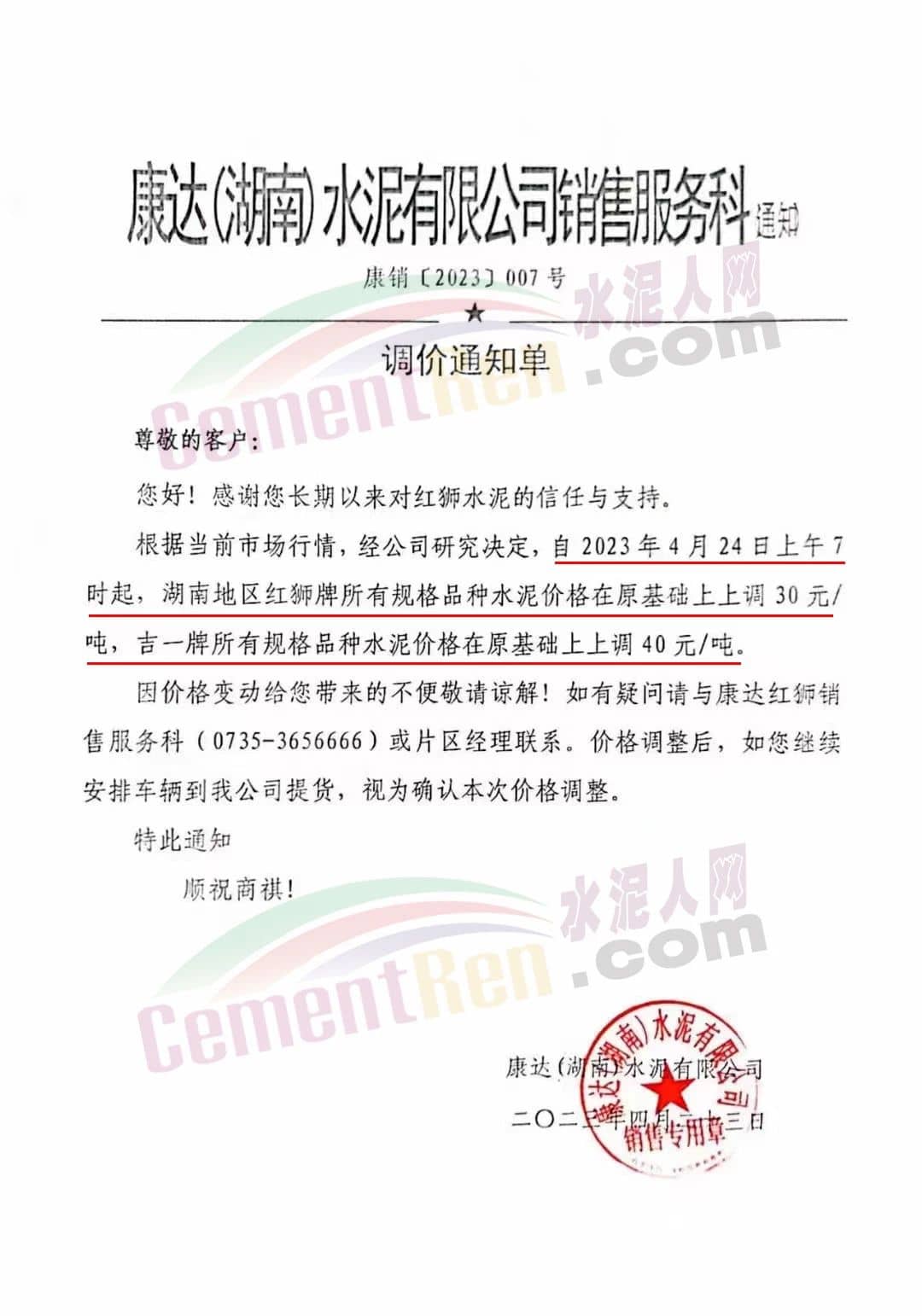 與上述區(qū)域類似,湖南區(qū)域紅獅水泥旗下康達(dá)湖水泥有限公司銷售服務(wù)科通知稱,根據(jù)當(dāng)前市場(chǎng)行情,經(jīng)公司研究決定,自2023年4月24日上午7時(shí)起,湖南地區(qū)紅獅牌所有規(guī)格品種水泥價(jià)格在原基礎(chǔ)上上調(diào)30元/噸,吉一牌所有規(guī)格品種水泥價(jià)格在原基礎(chǔ)上上調(diào)40元/噸。