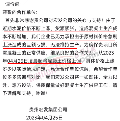 貴州宏發(fā)集團(tuán)公司2023年4月25日發(fā)調(diào)價(jià)函稱,由于近期水泥價(jià)格不斷上漲,貨源緊張。造成混凝土生產(chǎn)成本不斷增加,企業(yè)已無(wú)力承擔(dān)由于原材料價(jià)格急劇上漲造成的巨額虧損,無(wú)法維持生產(chǎn)。為確保項(xiàng)目所需混凝土的正常供應(yīng),維系良好的合作關(guān)系,從2023年4月25日凌晨起將混凝土價(jià)格上調(diào),具體價(jià)格上漲多少以實(shí)際情況確定。
