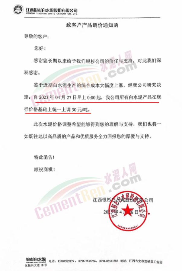 江西銀杉公司通知鑒于近期白水泥生產的綜合成本大幅度上漲,經公司研究決定,自2023年4月27日0時起,所有白水泥產品在現行價格基礎上上調30元/噸。