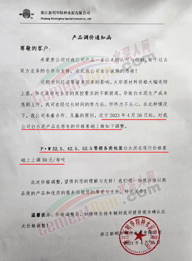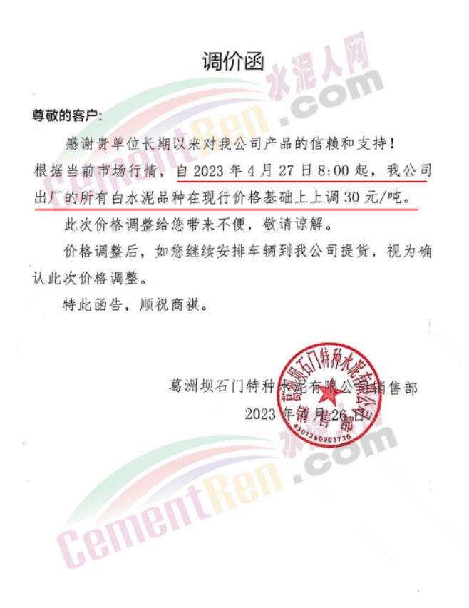 葛洲壩石門特種水泥有限公司銷售部通知,自2023年4月27日8時起,公司出廠的所有白水泥在現行價格基礎上上調30元/噸。
