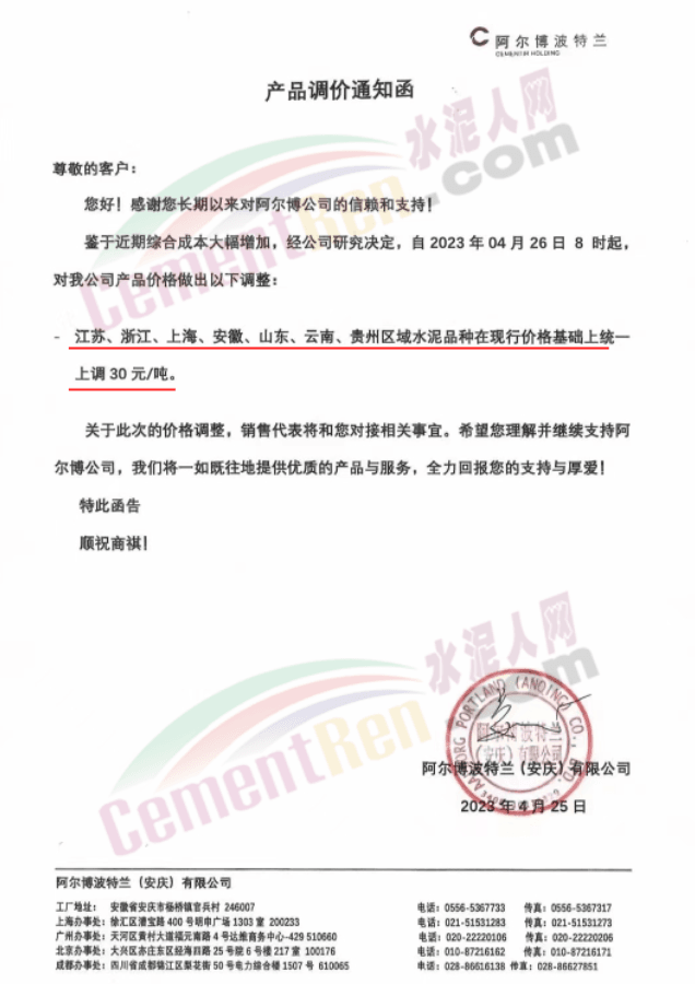 阿爾博波特蘭(安慶)有限公司通知,自2023年4月26日8時起對江蘇、浙江、上海、安徽、山東、云南、貴州區(qū)域水泥價格在現行基礎上上調30元/噸。