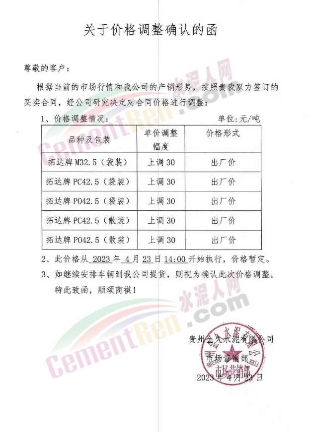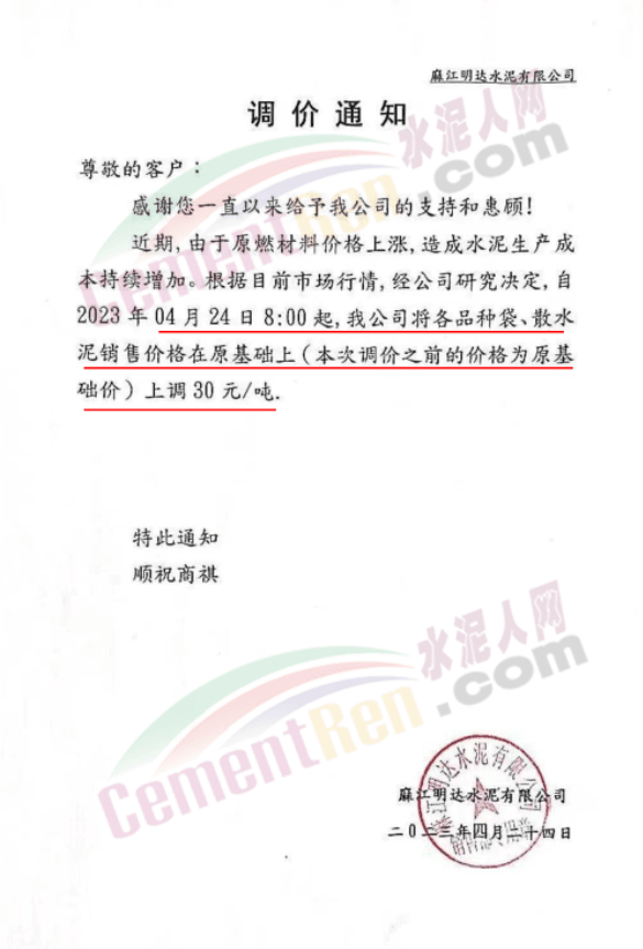 麻江明達水泥有限公司通知稱,近期由于原燃材料價格上漲,造成水泥生產成本持續(xù)增加。根據目前市場行情,自2023年4月24日8時起,公司將各品種袋、散水泥銷售價格在原基礎上上調30元/噸。