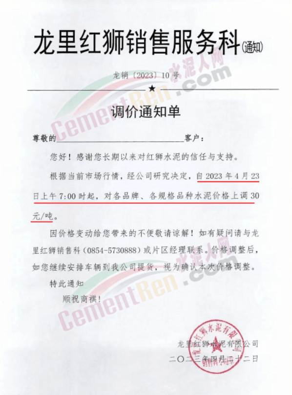 龍里紅獅水泥銷售服務科通知,自4月23日上午7時起,對各品牌、各規(guī)格品種水泥價格上調30元/噸。