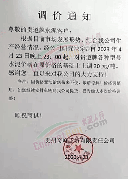 貴州奇峰工貿有限責任公司通知,自4月23日晚23時起,對貴遵牌各型號水泥價格在原價基礎上上調30元/噸。