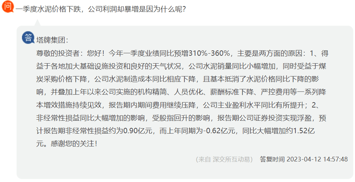 此前塔牌水泥在回復(fù)投資者提問時(shí)表示,自上年以來公司實(shí)施的機(jī)構(gòu)精簡(jiǎn)、人員優(yōu)化、薪酬標(biāo)準(zhǔn)下降、嚴(yán)控費(fèi)用等一系列降本增效措施持續(xù)見效,今年一季度期間費(fèi)用繼續(xù)壓降,公司主業(yè)盈利水平同比有所提升。