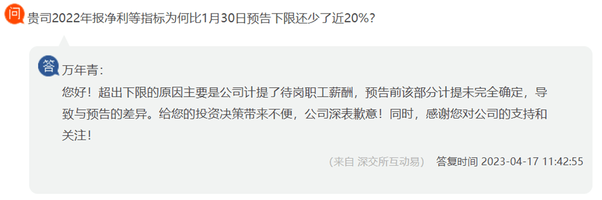 萬年青水泥上市公司在向投資者解釋為什么企業(yè)2022年凈利潤(rùn)等指標(biāo)比1月30日預(yù)告下限還少了近20%時(shí)表示,超出下限的原因主要是公司計(jì)提了待崗職工薪酬,預(yù)告前該部分計(jì)提未完全確定,導(dǎo)致與預(yù)告的差異。