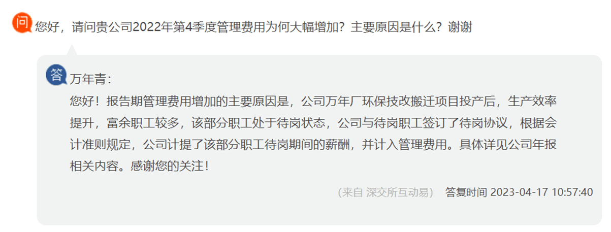 并提及2022年管理費(fèi)用增加的主要原因是,公司萬年廠環(huán)保技改搬遷項(xiàng)目投產(chǎn)后,生產(chǎn)效率提升,富余職工較多,該部分職工處于待崗狀態(tài),公司與待崗職工簽訂了待崗協(xié)議,根據(jù)會(huì)計(jì)準(zhǔn)則規(guī)定,公司計(jì)提了該部分職工待崗期間的薪酬,并計(jì)入管理費(fèi)用。