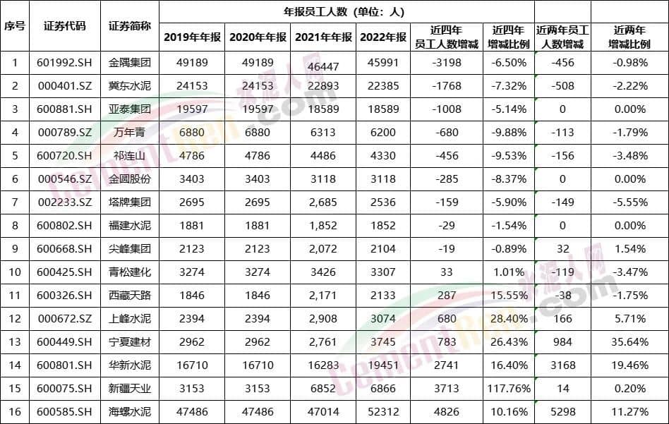 從2019~2022年16家水泥上市公司員工人數(shù)增減數(shù)據(jù)可見近四年來,金隅集團(tuán)、冀東水泥、亞泰集團(tuán)員工都有千人以上的減員。萬年青、祁連山、塔牌水泥均有百人以上的減員。2021~2012年金隅集團(tuán)、冀東水泥、萬年青、祁連山、塔牌集團(tuán)、青松建化等均有百人以上的減員,冀東水泥減員達(dá)500人以上。