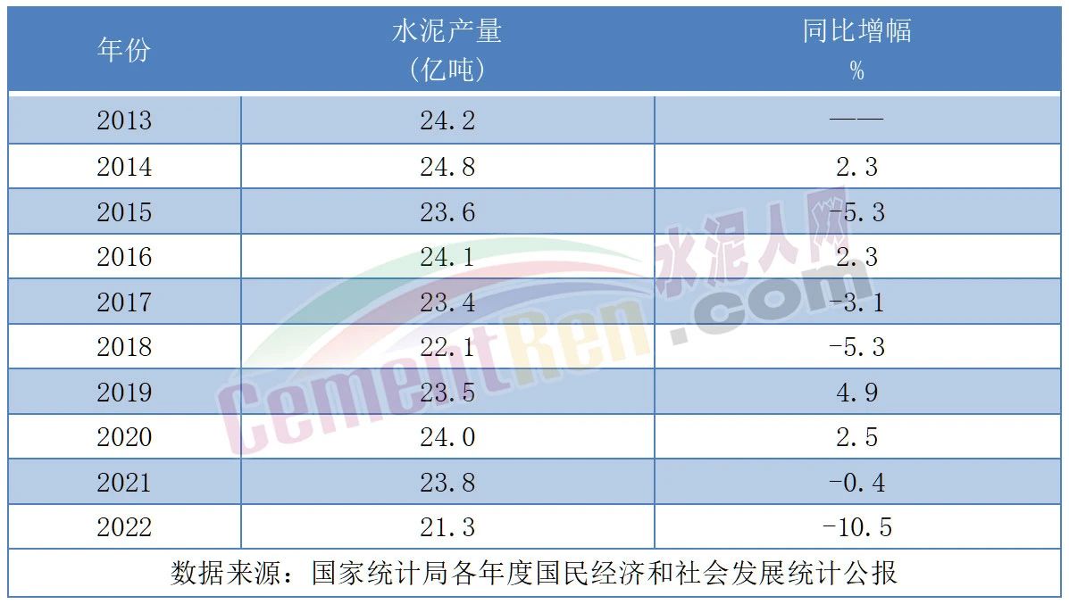 從近幾年國家統(tǒng)計(jì)局發(fā)布的數(shù)據(jù)來看, 全國水泥產(chǎn)量在2014年達(dá)到高位后開始回落。2022年全國水泥產(chǎn)量21.3億噸,同比下降10.5%,創(chuàng)下近十年來的最大跌幅。