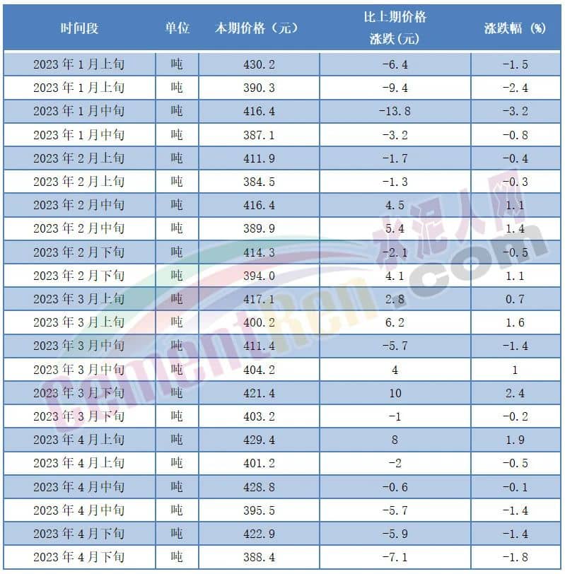 從水泥價(jià)格方面來看,2023年在煤炭價(jià)格大幅上漲的背景下,2023年1-4月流通領(lǐng)域P.O42.5散裝水泥均價(jià)為407元/噸,各時(shí)間段報(bào)價(jià)在384-430元/噸之間波動(dòng),且多個(gè)時(shí)間段水泥價(jià)格在400元/噸以下。