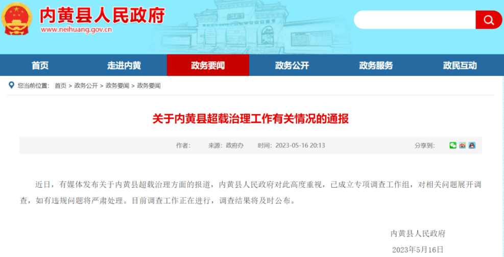 5月18日,內(nèi)黃縣人民政府發(fā)布《關(guān)于反映內(nèi)黃縣超載治理工作情況的調(diào)查通報》。