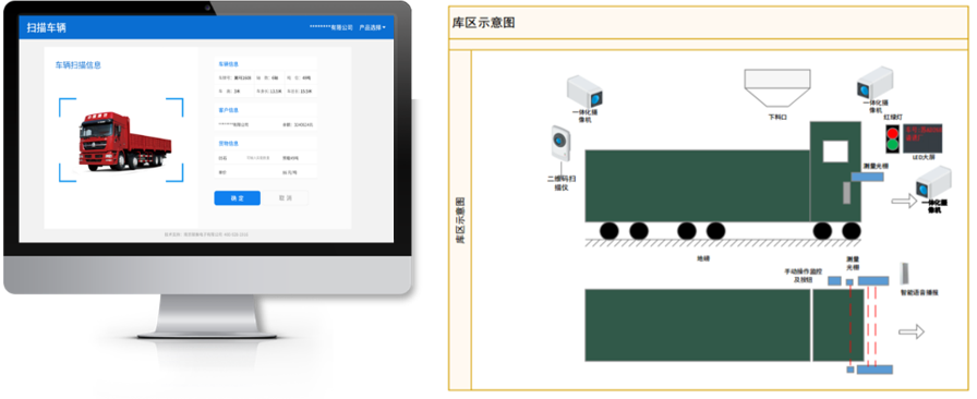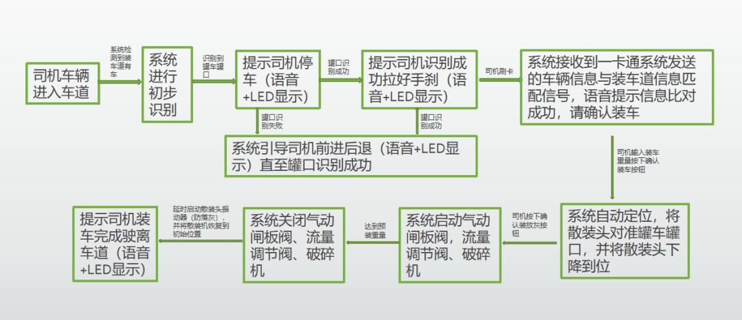 司機(jī)刷碼上磅時,控制系統(tǒng)會根據(jù)庫下面的光幕、紅外傳感器等設(shè)備檢測到車輛停的位置,并通過LED顯示屏及語音自動提示車輛停到指定的位置。當(dāng)車輛到達(dá)指定位置,司機(jī)準(zhǔn)備好可以裝車,系統(tǒng)自動測量車輛長度、高度,測量車廂長度、高度,獲取輪軸數(shù)據(jù)(車輛荷載噸位數(shù))、車牌信息,記錄完成,卸料口開始裝車,當(dāng)物料達(dá)到車廂高度時移動小車帶動皮帶機(jī)及散裝機(jī)水平移動裝車,直至裝滿整個車廂。如果未能停到指定位置,LED及語音進(jìn)行反復(fù)提示并在設(shè)定的時間后通知管理人員。