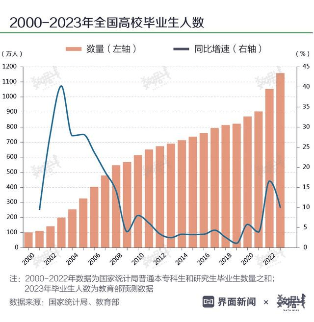 2023年,我國高校畢業(yè)生將達到1158萬人,這是在去年首破千萬后的又一新高。而在2000年,全國高校畢業(yè)生人數(shù)僅為100.9萬人,24年間實現(xiàn)超10倍增長。正如人社部部長王曉萍所說,普工難招、技術工人短缺,老百姓在求職就業(yè)中還面臨急難愁盼問題。