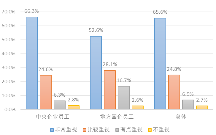 1.國(guó)企品牌建設(shè)意識(shí)不斷增強(qiáng)。2014年1月,國(guó)資委發(fā)布《關(guān)于加強(qiáng)中央企業(yè)品牌建設(shè)的指導(dǎo)意見(jiàn)》,要求中央企業(yè)努力打造世界一流品牌,隨后又發(fā)布《中央企業(yè)“十三五”發(fā)展規(guī)劃綱要》《國(guó)資委加強(qiáng)中央企業(yè)科技創(chuàng)新的工作舉措》《關(guān)于加強(qiáng)中央企業(yè)質(zhì)量品牌工作的指導(dǎo)意見(jiàn)》等文件,不斷完善國(guó)企品牌建設(shè)的頂層設(shè)計(jì)和戰(zhàn)略規(guī)劃。國(guó)企黨組織對(duì)品牌建設(shè)的重視程度顯著提升,品牌意識(shí)普遍得到增強(qiáng),一些企業(yè)將品牌建設(shè)當(dāng)作重要政治任務(wù)和“一把手”工程來(lái)抓。調(diào)研顯示,65.6%的國(guó)企職工認(rèn)為其所在企業(yè)的黨委領(lǐng)導(dǎo)班子非常重視品牌建設(shè),24.8%的國(guó)企職工認(rèn)為比較重視。尤其中央企業(yè)職工對(duì)領(lǐng)導(dǎo)班子比較重視和非常重視世界一流品牌建設(shè)的認(rèn)可度超過(guò)90%(見(jiàn)圖1)。在“您認(rèn)為國(guó)企建設(shè)世界一流企業(yè),品牌的重要性”選項(xiàng)調(diào)查中,有82.71%的人認(rèn)為非常重要,有13.55%的人認(rèn)為很重要,二者高達(dá)96.26%,可見(jiàn)國(guó)企全體人員有著非常強(qiáng)的品牌意識(shí)。