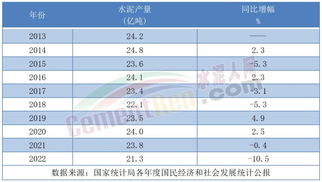 從近幾年國家統(tǒng)計局發(fā)布的數(shù)據(jù)來看,全國水泥產(chǎn)量在2014年達到高位后開始回落。2022年全國水泥產(chǎn)量21.3億噸,同比下降10.5%,創(chuàng)下近十年來的最大跌幅。