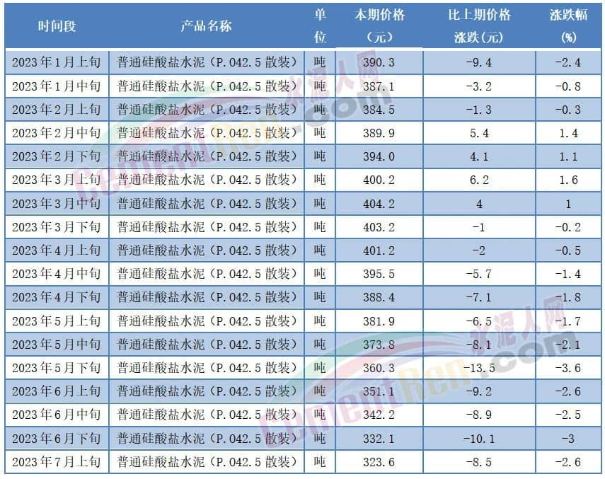 價格方面,突破近5年同期新低。近期公布的2023年7月上旬P.O42.5散裝水泥報價323.6元/噸,同比上年同期377.8元/噸下跌54.2元/噸,跌幅14.35%。相比今年1月上旬下跌66.7元/噸,跌幅17.09%。